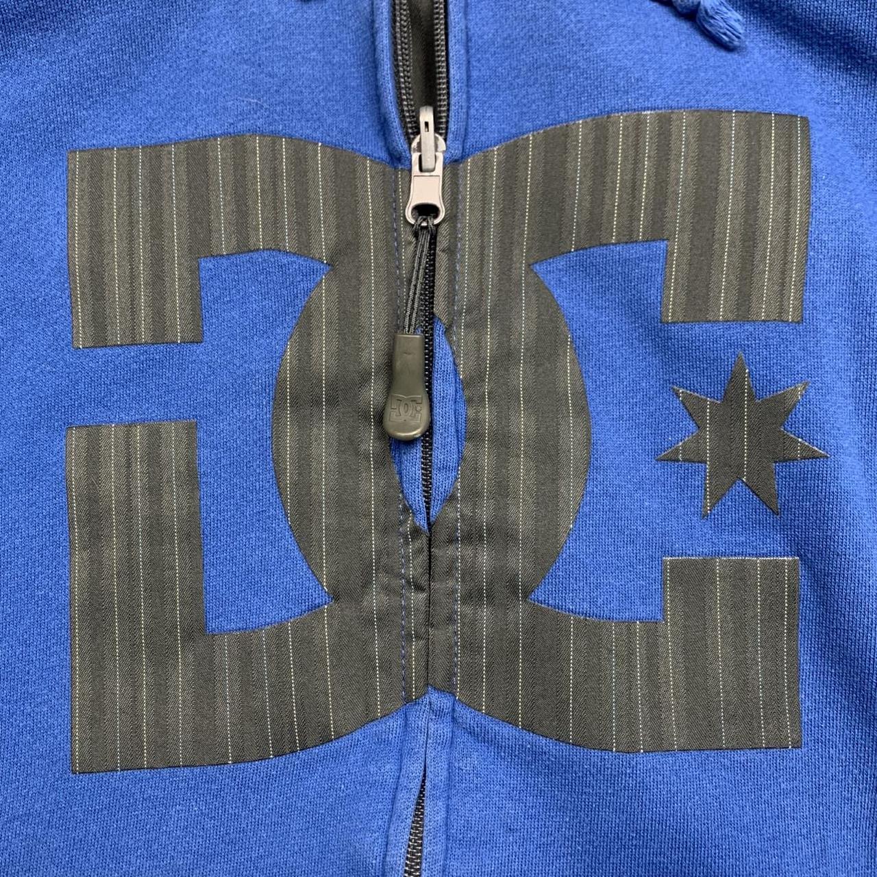 Sick DC hoodie with a blue/black side with a large graphic across the zip, a pinstripe grey side with a small green logo & in very good second hand condition with wear as shown.